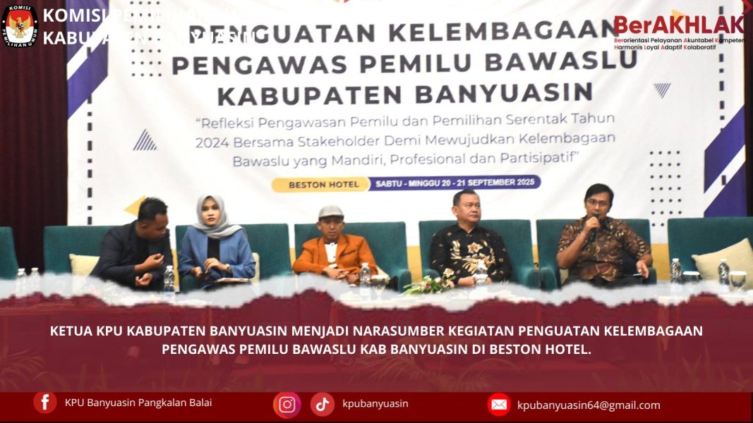 #Temanpemilih, Ketua KPU Kabupaten Banyuasin berkesempatan hadir menjadi narasumber kegiatan Penguatan Kelembagaan Pengawas Pemilu Bawaslu Kab Banyuasin di Beston Hotel. #KPUmelayani ....