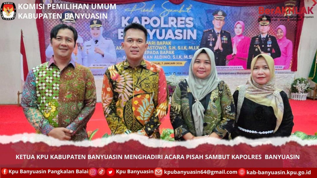 #Temanpemilih, (7/1/2026) Ketua KPU Kabupaten Banyuasin menghadiri undangan pisah sambut Kapolres Banyuasin. Sebagai bentuk apresiasi dan penghormatan atas dedikasi pejabat lama serta penyambutan pejabat baru di lingkungan Polres Banyuasin, Pemerintah Kabupaten Banyuasin menggelar acara pisah sambut Kapolres Banyuasin dari AKBP Ruri Prastowo, SH S.IK M.IK, yang saat ini menjabat sebagai Kapolres Musi Banyuasin, Kepada AKBP Risnan Aldino, S.IK M.Si, Kapolres Banyuasin yang sebelumnya menjabat sebagai Kasubdit Gakkum Ditpolairud Polda Aceh. #KPUmelayani ....