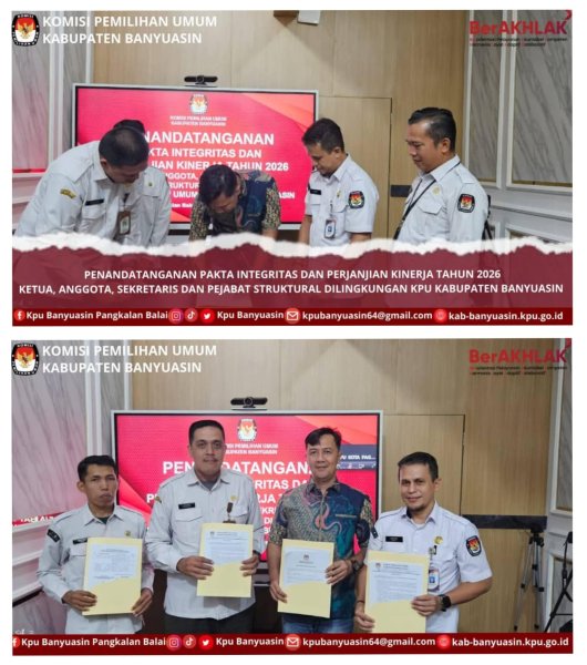 #TemanPemiliih KPU Kabupaten Banyuasin mengikuti Penandatanganan Pakta Integritas dan Perjanjian Kinerja Tahun 2026 secara serentak se-Sumatera Selatan melalui Zoom Meeting. Kegiatan ini diikuti oleh pimpinan dan jajaran pejabat struktural serta pejabat fungsional seluruh pegawai di lingkungan Provinsi, kabupaten/kota di Sumatera Selatan. Penandatanganan dilakukan sebagai bentuk komitmen bersama dalam mewujudkan tata kelola organisasi yang bersih, transparan, dan akuntabel, serta sebagai dasar pelaksanaan tugas dan fungsi pada tahun 2026. #KPUmelayani ....
