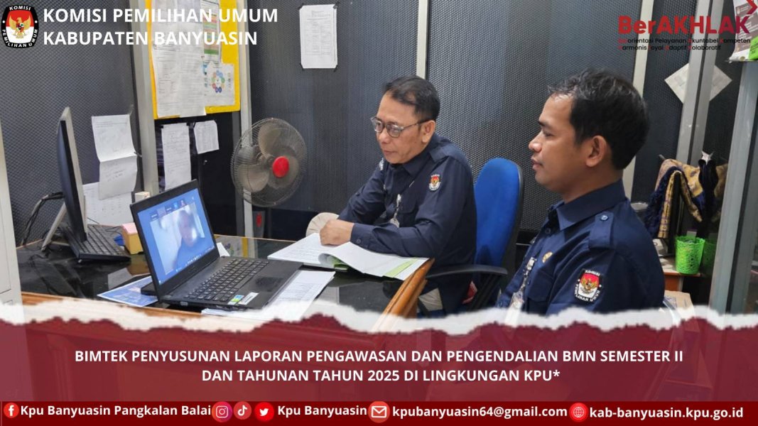 #Temanpemilih, (Selasa 20/1/2026) Kasubbag Keuangan, Umum dan Logistik beserta staf KPU Kabupaten Banyuasin mengikuti Bimbingan Teknis Penyusunan Laporan Pengawasan dan Pengendalian Barang Milik Negara (BMN) Semester II dan Tahunan Tahun 2025 di lingkungan Komisi Pemilihan Umum yang dilaksanakan secara daring. #KPUMelayani ------------------------------------- Temukan Kami Di: Facebook: KPU Banyuasin Pangkalan Balai Instagram: @kpubanyuasin TikTok: @kpubanyuasin YouTube: KPU Banyuasin Twitter: @kpubanyuasin Situs web: https://kab-banyuasin.kpu.go.id Alamat: Jl.Thalib Wali No.01, Pangkalan Balai, Kec. Banyuasin III, Kab. Banyuasin, Sumatera Selatan 30911 ....