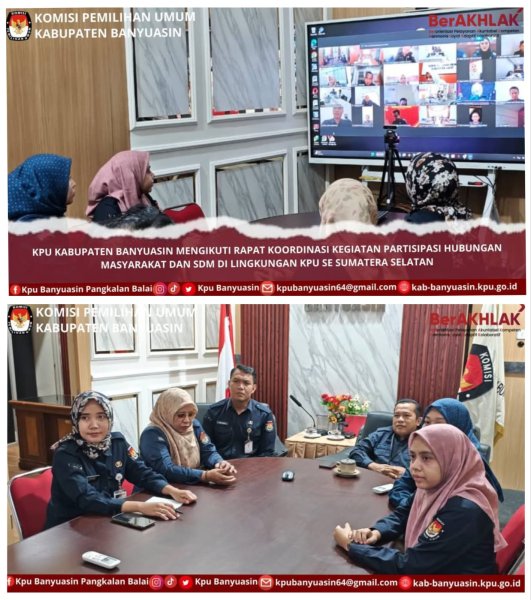 #Temanpemilih (Selasa, 20/1/2026) Kasubbag Partisipasi Hubungan Masyarakat dan Sumber Daya Manusia Bapak Alamsyah, SH.,MM beserta Staf mengikuti secara daring Rapat Koordinasi Kegiatan Partisipasi Hubungan Masyarakat dan SDM di lingkungan KPU se Sumatera Selatan. #KPUmelayani ------------------------------------- Temukan Kami di: Facebook: KPU Banyuasin Pangkalan Balai Instagram: @kpubanyuasin TikTok: @kpubanyuasin YouTube: KPU Banyuasin Twitter: @kpubanyuasin Situs web: https://kab-banyuasin.kpu.go.id Alamat : Jl. Thalib Wali No.01, Pangkalan Balai, Kec. Banyuasin III, Kab. Banyuasin, Sumatera Selatan 30911 ....