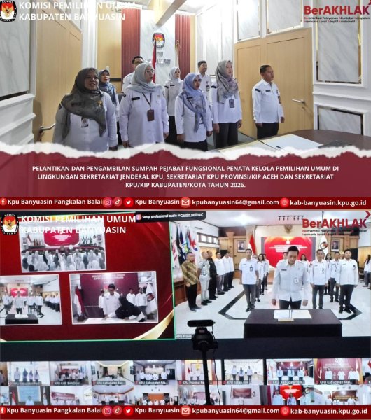 #TemanPemilih KPU Kabupaten Banyuasin mengikuti Pelantikan dan Pengambilan Sumpah Pejabat Fungsional Penata Kelola Pemilihan Umum di Lingkungan Sekretariat Jenderal KPU, Sekretariat KPU Provinsi/KIP Aceh dan Sekretariat KPU/KIP Kabupaten/Kota Tahun 2026 Kegiatan ini merupakan langkah penting dalam memastikan setiap pejabat fungsional memiliki komitmen, integritas, serta kompetensi profesional dalam menjalankan tugasnya. Dengan aparatur yang handal, pengelolaan administrasi dan dukungan teknis pemilu dapat berjalan lebih tertib dan akuntabel. KPU terus berupaya memperkuat kualitas penyelenggaraan pemilu melalui peningkatan kapasitas sumber daya manusia secara berkelanjutan. #KPUmelayani ....