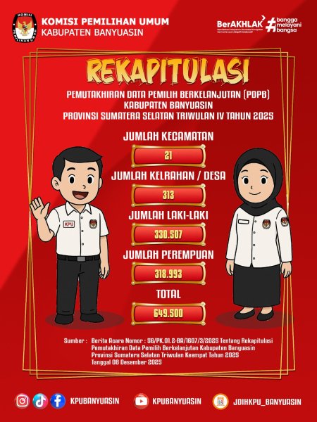 #TemanPemilih Berikut adalah Hasil Rekapitulasi Pemutakhiran Data Pemilih Berkelanjutan Triwulan IV Berdasarkan Berita Acara Nomor : 56/PK.01.2-BA/1607/3/2025 Tentang Rekapitulasi Pemutakhiran Data Pemilih Berkelanjutan Kabupaten banyuasin Provinsi Sumatera Selatan Triwulan IV Tahun 2025 telah dilaksanakan dan di sahkan oleh KPU Kabupaten Banyuasin pada Tanggal 08 Desember Tahun 2025.